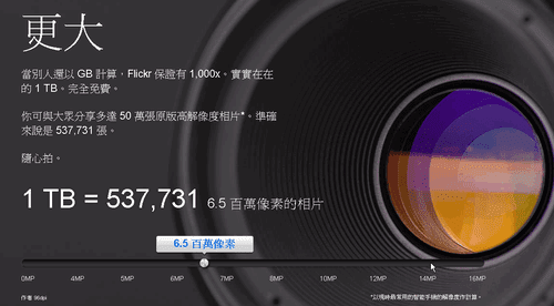 確實,新版 Flikcr 提供的「 1 TB 」雲端照片上傳空間是非常吸引人的,如果你每個小時都上傳一張 600 萬畫素的照片,那麼可以連續上傳 40 年;如果以一張手機照片 2 MB 大小來計算的話大約可以上傳 50 萬張照片,若是每天上傳 20 張照片就可以上傳 68 年,真的是個可怕的數字。