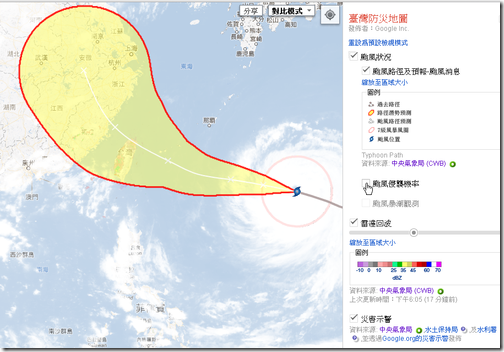第一張地圖跟每年夏天在台灣都會遇上的颱風有關,透過台灣政府開放資料與 Google 台灣之間的合作,打造了這張台灣防災地圖,可以查看颱風路徑,更重要的是可以查到各種淹水、災情、道路封閉的地圖資訊。