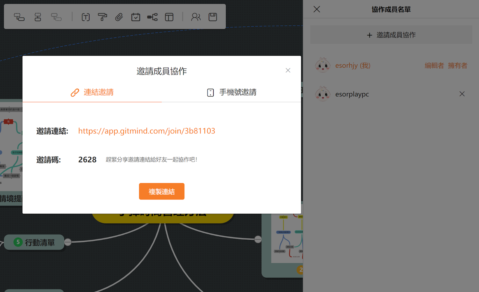 - 合作夥伴打開邀請連結,要進入這份心智圖時,再輸入邀請碼,才能真正打開這份心智圖。