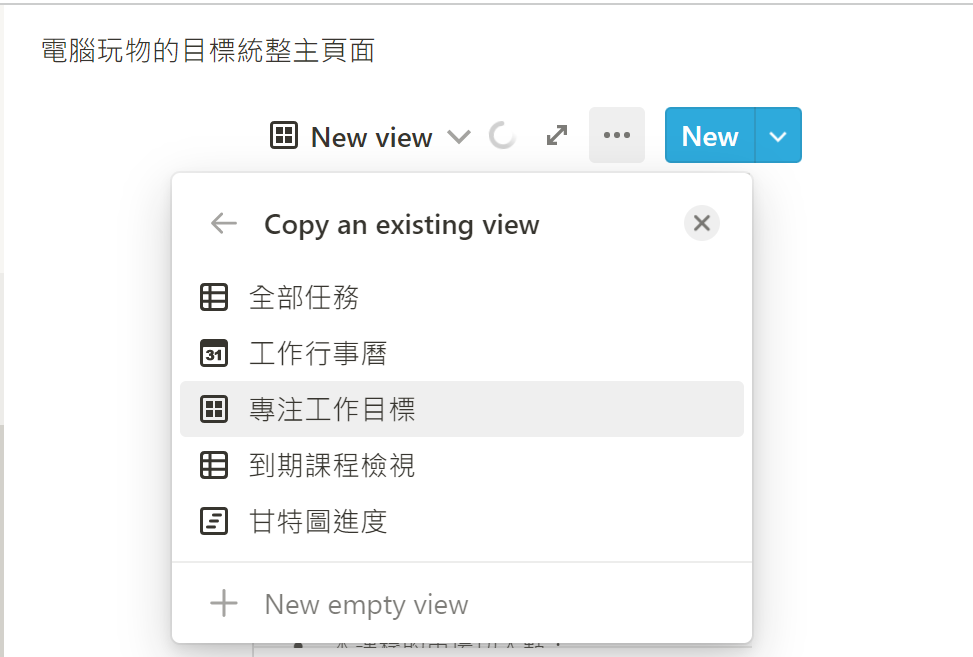 不過這樣還不夠,因為上述「工作任務」這個資料庫裡的任務太多了,有時候我需要專注在重要大專案上,有時候我要聚焦處理即將到期的課程小任務。那麼,就可以利用 Notion 資料庫的各種過濾、排序、分組功能,設計出更多符合我真實需要的「 View 」,在分頁中快速切換。