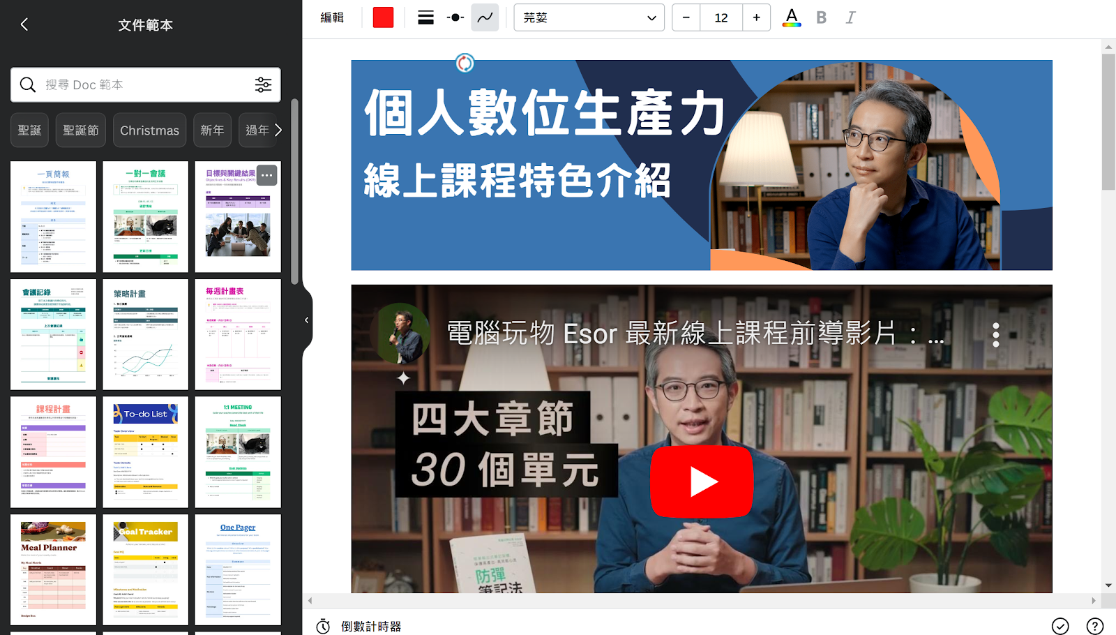 新的「 Canva Docs」文件功能,當然有結合之前常見的一些設計工具,不過可以更方便的幫我們製作出像是會議記錄、課堂報告、專案企劃等等「文件」,這也讓已經具備專屬白板、流程圖、統計圖表與簡報等功能的 Canva (當然還有原本核心的各種圖像設計工具),愈來愈像一套完整的辦公室文書系統了。