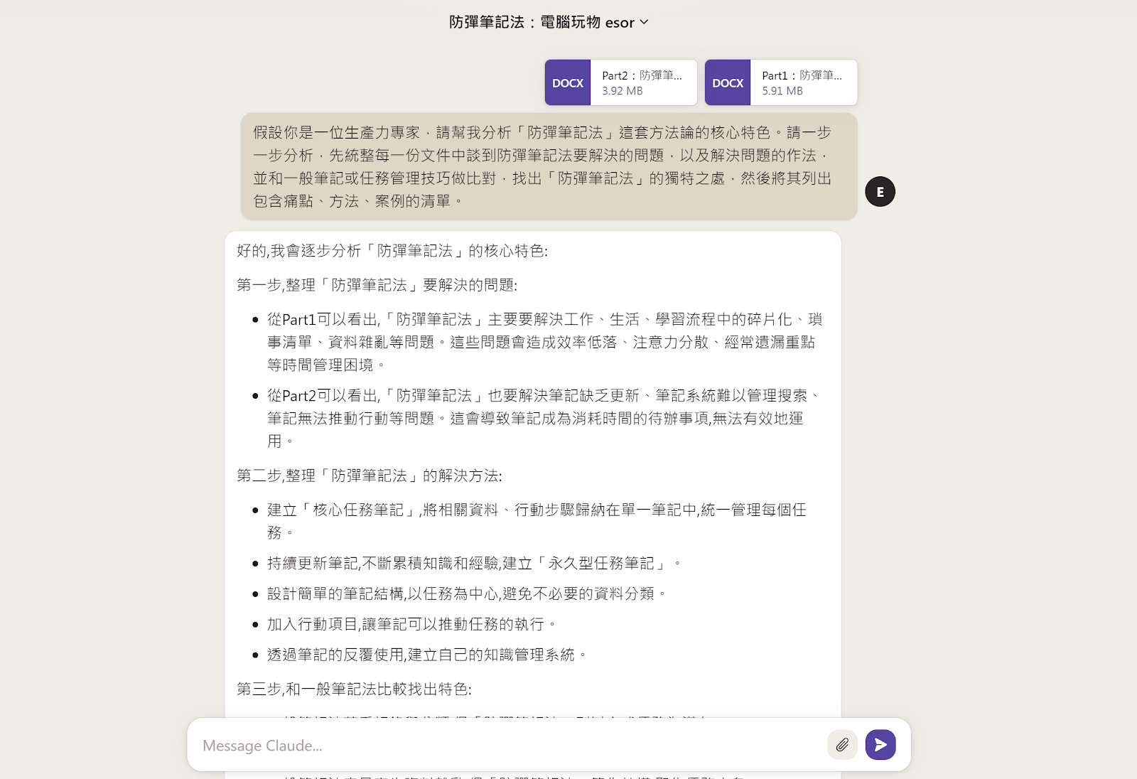 我這邊使用的提示語為:「根據兩份文件,找出「核心任務筆記」如何解決碎片化、資料雜亂的問題,請引用原文,進行重點統整。」