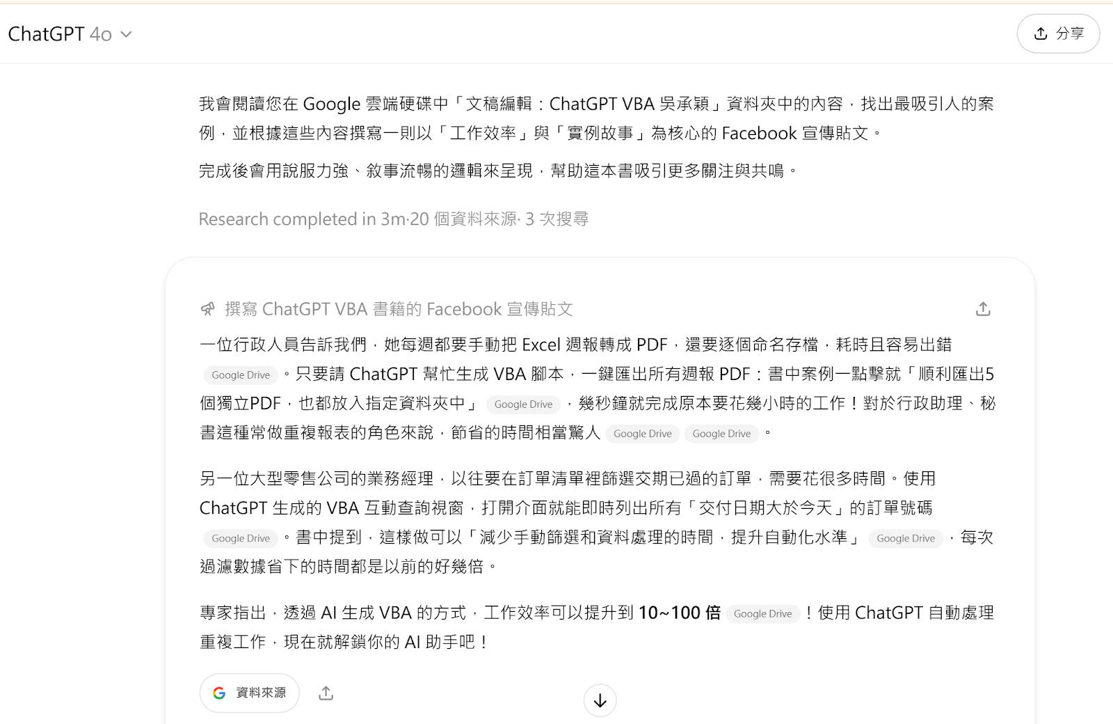 - 操作範例:讀取 Google Drive 中的書籍草稿,讓 ChatGPT 生成 Facebook 宣傳貼文、讀取記帳試算表、產出統整報告。